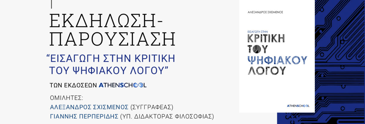 Το Σάββατο 19 Μαρτίου 2022 διοργανώθηκε η παρουσίαση του βιβλίου του συντάκτη μας Αλέξανδρου Σχισμένου ΕΙΣΑΓΩΓΗ ΣΤΗΝ ΚΡΙΤΙΚΗ ΤΟΥ ΨΗΦΙΑΚΟΥ ΛΟΓΟΥ, που κυκλοφορεί από τις εκδόσεις της εκπαιδευτικής και πολιτιστικής Κοιν.Σ.Επ. Athens School, στην έδρα τους (Χαριλάου Τρικούπη 138). Για το βιβλίο μίλησε ο συγγραφέας και ο συνεργάτης μας Γιάννης Περπερίδης, υποψήφιος διδάκτορας στη Φιλοσοφία … Συνεχίστε να διαβάζετε το Βιβλιοπαρουσίαση: ΕΙΣΑΓΩΓΗ ΣΤΗΝ ΚΡΙΤΙΚΗ ΤΟΥ ΨΗΦΙΑΚΟΥ ΛΟΓΟΥ (ηχητικό+βίντεο).