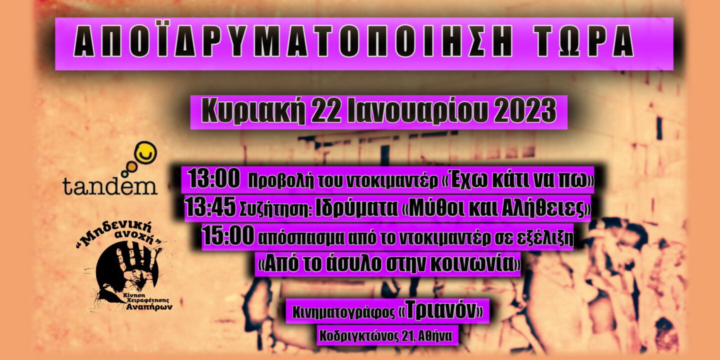 Η Κίνηση Χειραφέτησης Αναπήρων «ΜΗΔΕΝΙΚΗ ΑΝΟΧΗ» σε συνεργασία με την Tandem μας προσκαλούν στον κινηματογράφο…Περισσότερα…