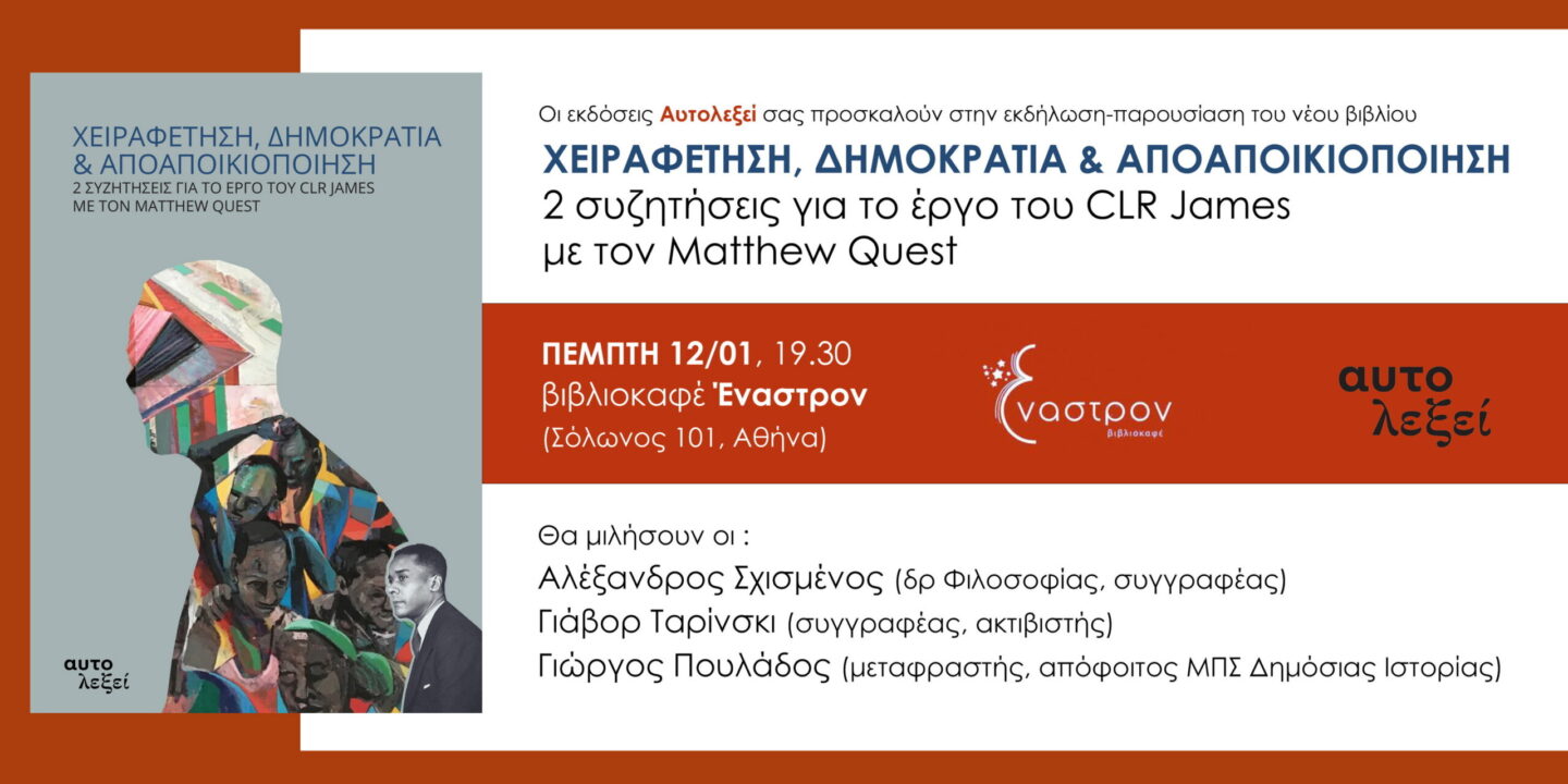 Οι ελευθεριακές εκδόσεις Αυτολεξεί σας προσκαλούν στην εκδήλωση-παρουσίαση του νέου βιβλίου «Χειραφέτηση, δημοκρατία & αποαποικιοποίηση…Περισσότερα…
