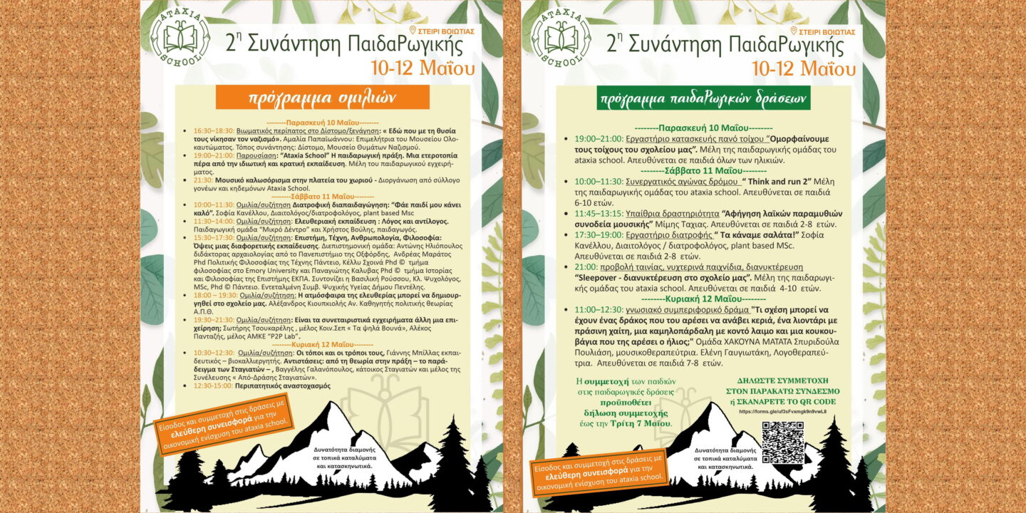 2η Συνάντηση ΠαιδαΡωγικής 10-12 Μαΐου στο Στείρι Βοιωτίας. Διοργάνωση: Ataxia School – Δημοκρατικό Σχολείο του…Περισσότερα…