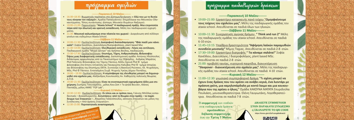 2η Συνάντηση ΠαιδαΡωγικής 10-12 Μαΐου στο Στείρι Βοιωτίας. Διοργάνωση: Ataxia School – Δημοκρατικό Σχολείο του Βουνού. Εκλεκτές ομιλήτριες και ομιλητές από διαφορετικά πεδία θεωρίας και δράσης. Πλούσιο παιδαΡωγικό πρόγραμμα για τους μικρούς φίλους και φίλες, περπάτημα στην εξοχή και φυσικά μουσική. ΠΡΟΓΡΑΜΜΑ ΟΜΙΛΙΩΝ 3ΗΜΕΡΟΥ ΠΑΙΔΑΡΩΓΙΚΗΣ ΣΥΝΑΝΤΗΣΗΣ Παρασκευή 10 Μαΐου 16:30-18:30: Βιωματικός περίπατος στο Δίστομο/ξενάγηση: «Εδώ … Συνεχίστε να διαβάζετε το 2η Συνάντηση ΠαιδαΡωγικής 10-12 Μαΐου – ΑΝΑΛΥΤΙΚΟ ΠΡΟΓΡΑΜΜΑ 3ΗΜΕΡΟΥ.