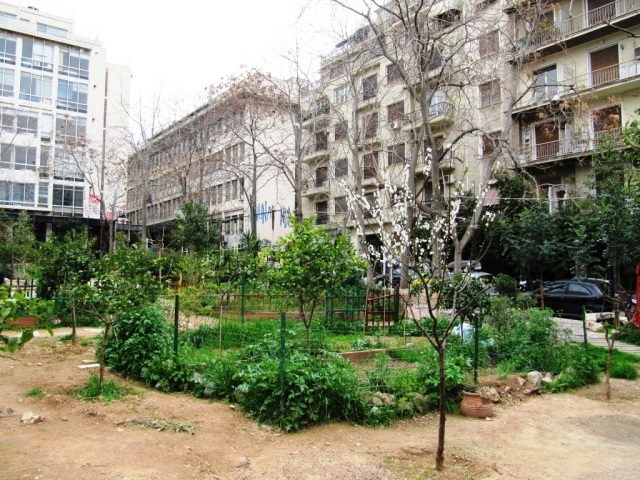 Η γειτονιά των Εξαρχείων αποτελεί παράδειγμα αυτού του δυναμικού του δομημένου περιβάλλοντος στο κέντρο της Αθήνας. Πρόκειται για μια ολόκληρη γειτονιά με πολιτικό και κοινοτικό πνεύμα (Μπαμπούλιας, 2014). Ένα άδειο οικόπεδο που κάποτε προοριζόταν να μετατραπεί σε χώρο στάθμευσης έχει τεθεί υπό κοινοτικό έλεγχο και έχει μετατραπεί σε πράσινη όαση από ακτιβιστές. Αυτή η κοιτίδα εναλλακτικών τρόπων ζωής αντιστέκεται στην ελληνική κρίση μέσω ενός πνεύματος πολιτών και αλληλεγγύης χρησιμοποιώντας τα άδεια κτίρια ως υλικά εδάφη για την ανάπτυξή τους.