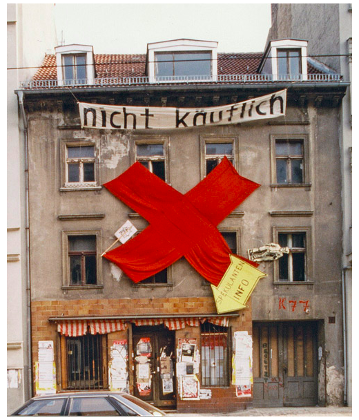 Το Kastanienalle 77, ή K77, στο Ανατολικό Βερολίνο αποτελεί παράδειγμα για το πώς εξελίσσεται αυτή η προοδευτική μετάβαση από την κατάληψη σε κοινόχρηστο σχέδιο στέγασης και πώς «ο αρχιτεκτονικός πειραματισμός έρχεται να παίξει στην απόδοση εναλλακτικών πολιτικών πρακτικών» (Vasudevan, 2017). Η πτώση του Τείχους του Βερολίνου επιτάχυνε ένα κύμα καταλήψεων στο Ανατολικό Βερολίνο, από το οποίο πηγάζει το K77, ένα εγκαταλελειμμένο συγκρότημα τριών σπιτιών και τριών εσωτερικών αυλών που φιλοξένησε περισσότερα από 100 άτομα από τη δημιουργία του. Σύμφωνα με τα λόγια του Γερμανού καλλιτέχνη Joseph Beuys, το Κ77 είναι ο καρπός μιας προσπάθειας να οικοδομηθεί ένα «κοινωνικό γλυπτό» σε έναν κοινό χώρο για «μη ειδικευμένη, αυτοπροσδιοριζόμενη, κοινοτική ζωή, εργασία, κουλτούρα». Το K77 αναπτύχθηκε και εξελίχθηκε σε ένα «αρχιτεκτονικό εργαστήριο για τη συμμετοχή των χρηστών και την αυτοοργάνωση» που φιλοξενεί έναν μη κερδοσκοπικό κινηματογράφο, ένα εργαστήριο κεραμικής, ένα στούντιο και μια ομοιοπαθητική κλινική (Vasudevan 2017)