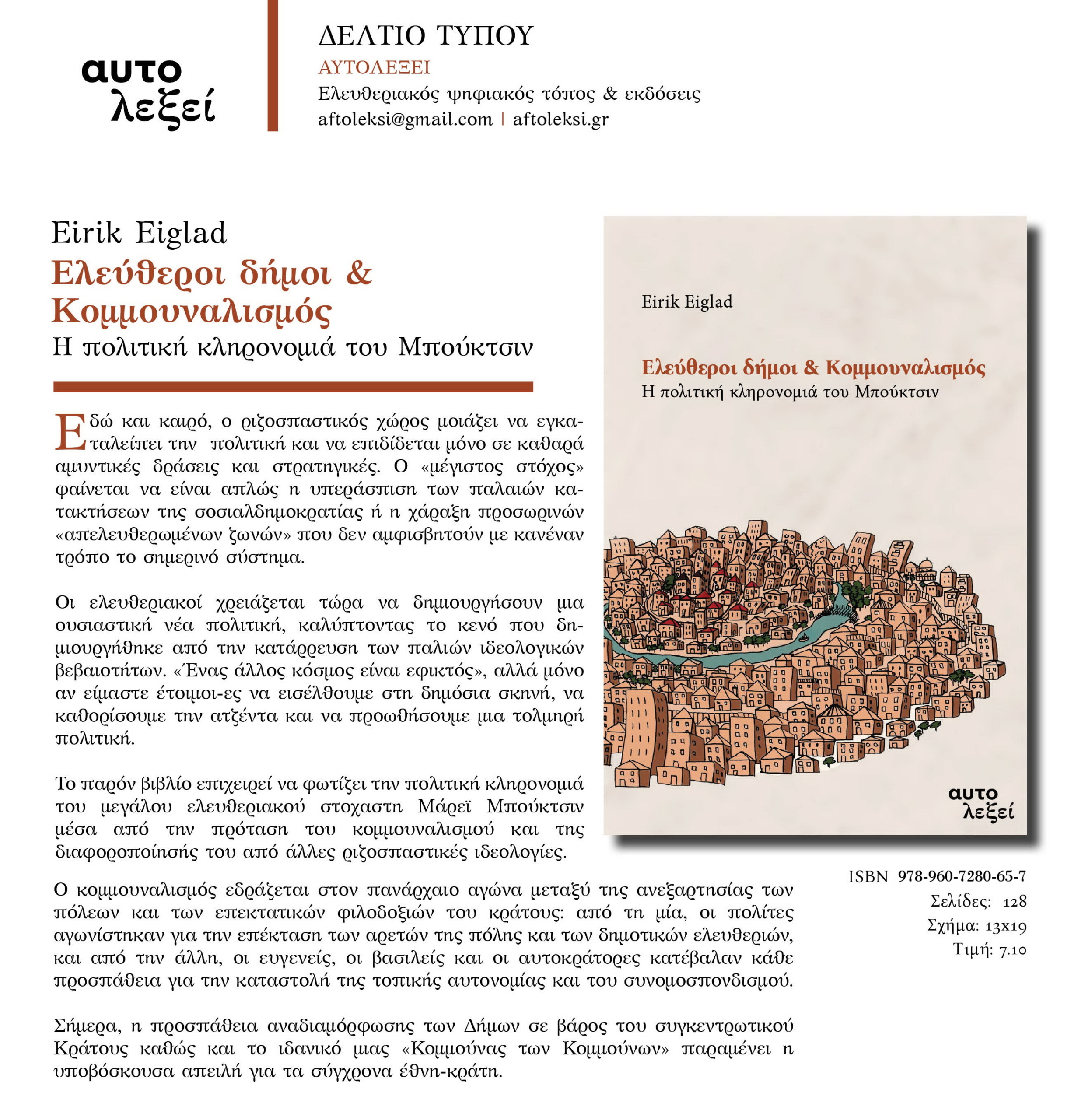 Eirik Eiglad, ΕΛΕΥΘΕΡΟΙ ΔΗΜΟΙ & ΚΟΜΜΟΥΝΑΛΙΣΜΟΣ. Η πολιτική κληρονομιά του Μπούκτσιν, Αθήνα: Αυτολεξεί, Νοέμβριος 2024, σελ. 128, διαστάσεις 19×13, ISBN 978-960-7280-65-7. Μετάφραση-Επιμέλεια: Ιωάννα-Μαρία Μαραβελίδη | Γραφιστικός σχεδιασμός – σελιδοποίηση: Απόλλωνας Πετρόπουλος | Εξώφυλλο: Τόνια Λέντζου