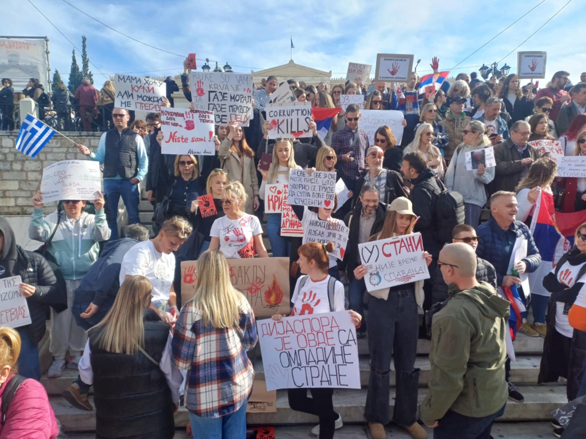 Άνθρωποι από τη Σερβία συμμετείχαν και αυτοί στις συγκεντρώσεις, καθώς έχουν ξεσηκωθεί και στη χώρα τους για τα δικά τους αντίστοιχα Τέμπη.