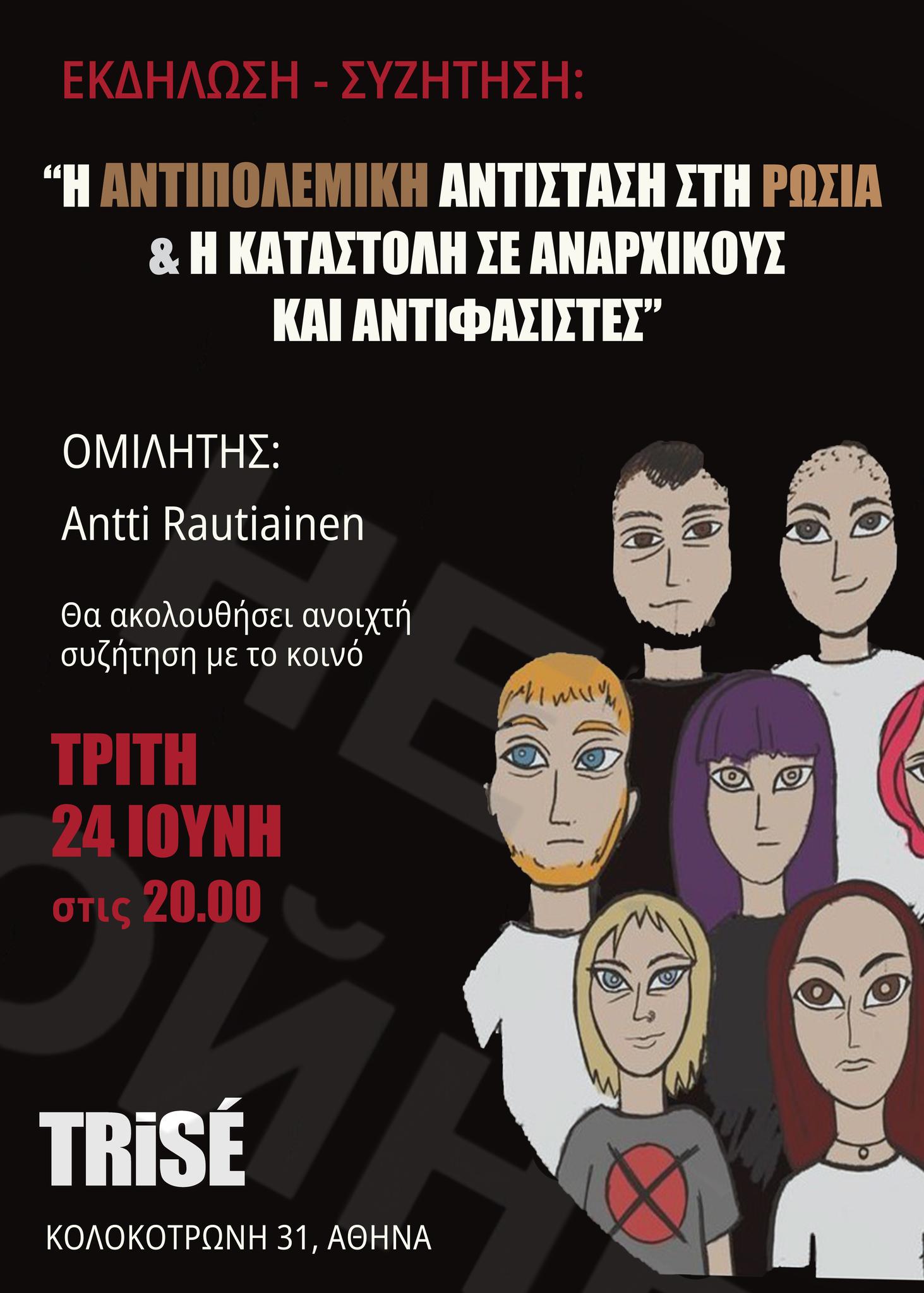 [ENG below] Ο αυτοδιαχειριζόμενος κοινωνικός χώρος TRISE μας προσκαλεί σε μια δημόσια συζήτηση σχετικά με την πολιτική καταστολή στη Ρωσία. Μαζί μας θα βρίσκεται και θα μιλήσει ο Antti Rautiainen* για να μας μεταφέρει την εμπερία του από τα κινήματα της περιοχής.