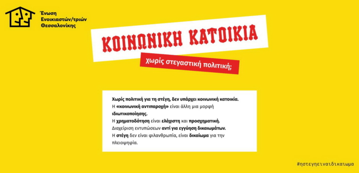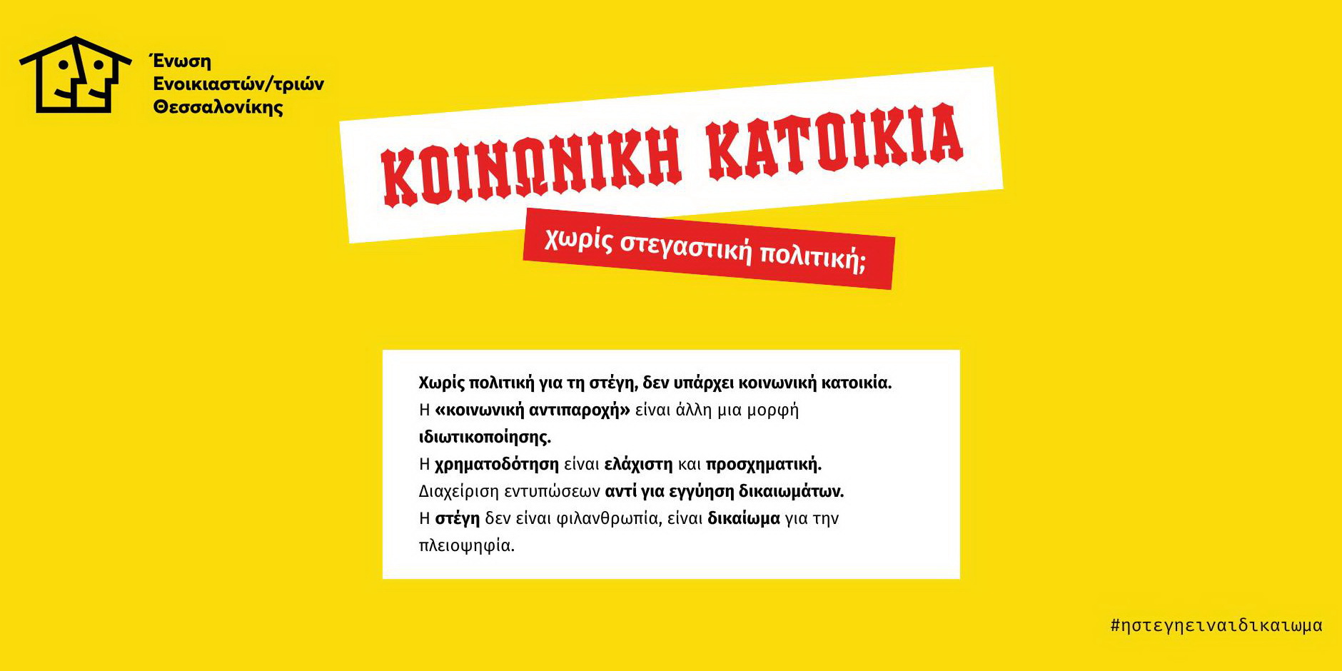 Αντί για κατοχύρωση του δικαιώματος στη στέγη, επικοινωνιακή διαχείριση της στεγαστικής κρίσης. Η κυβέρνηση διαφημίζει την «κοινωνική κατοικία» χωρίς να αναγνωρίζει την ανάγκη για απο-εμπορευματοποίηση της στέγης, χωρίς να αμφισβητεί το μοντέλο που μας έφερε ως εδώ, χωρίς να διασφαλίζει θεσμικά δικαιώματα για τους ενοικιαστές, χωρίς να βάζει φρένο στην αισχροκέρδεια των εκμισθωτών, των μεσιτών και των επενδυτών.