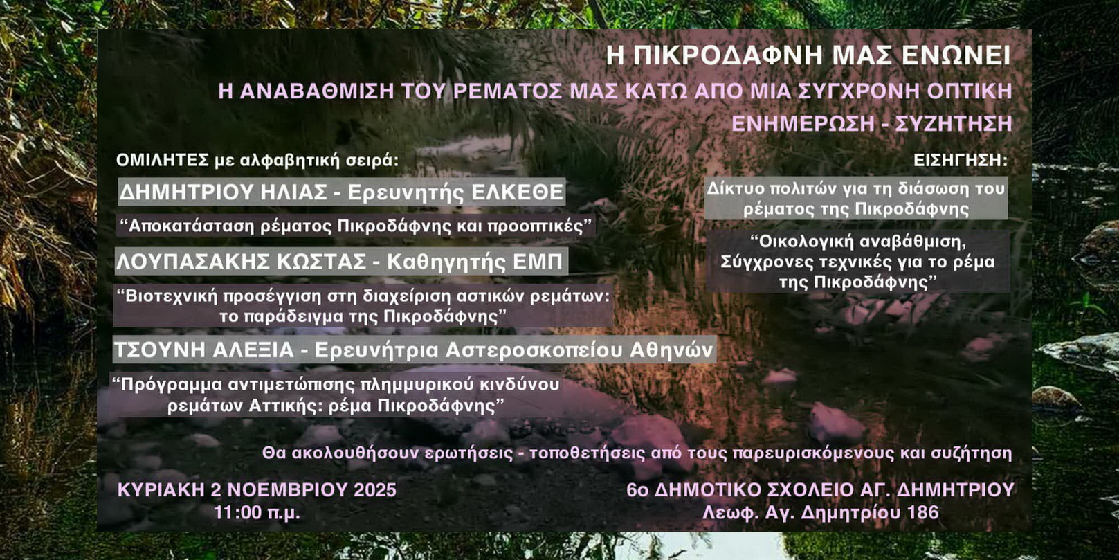 Το Δίκτυο Πολιτών για τη διάσωση του ρέματος της Πικροδάφνης, διοργανώνει την Κυριακή 2 Νοεμβρίου, στις 11 το πρωί, στο 6ο Δημοτικό Σχολείο (Λ. Αγ. Δημητρίου 186), ενημερωτική συζήτηση με θέμα: “Η αναβάθμιση του ρέματός μας κάτω από μία σύγχρονη οπτική”