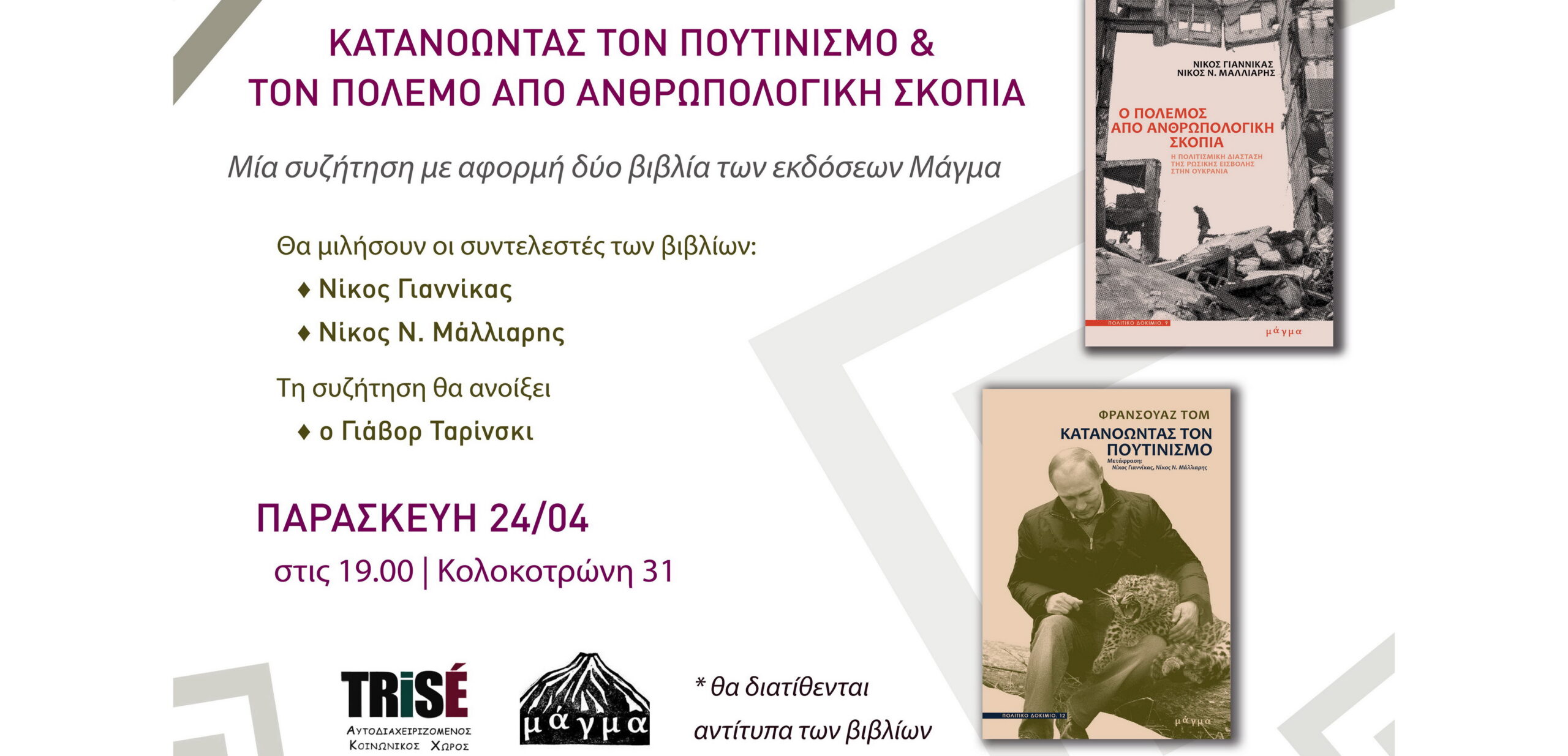 Σας καλούμε σε μία εκδήλωση-συζήτηση με αφορμή δύο βιβλία των εκδόσεων Μάγμα: Ο πόλεμος από ανθρωπολογική σκοπιά: Η πολιτισμική διάσταση της ρωσικής εισβολής στην Ουκρανία των Ν. Μάλλιαρη και Ν. Γιαννίκα και το ολοκαίνουργιο Κατανοώντας τον πουτινισμό της σοβιετολόγου και ιστορικού Φρανσουάζ Τομ.