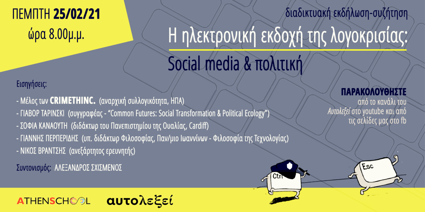 Διαδικτυακή εκδήλωση-συζήτηση: «Η ηλεκτρονική εκδοχή της λογοκρισίας: Social media & πολιτική» | ΠΕΜΠΤΗ 25/2/21, ώρα 8.00μ.μ.…Περισσότερα…