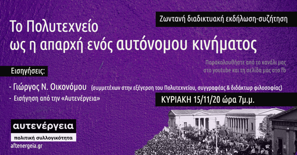 Ζωντανή διαδικτυακή εκδήλωση – συζήτηση με θέμα «Το Πολυτεχνείο ως η απαρχή ενός αυτόνομου κινήματος»,…Περισσότερα…