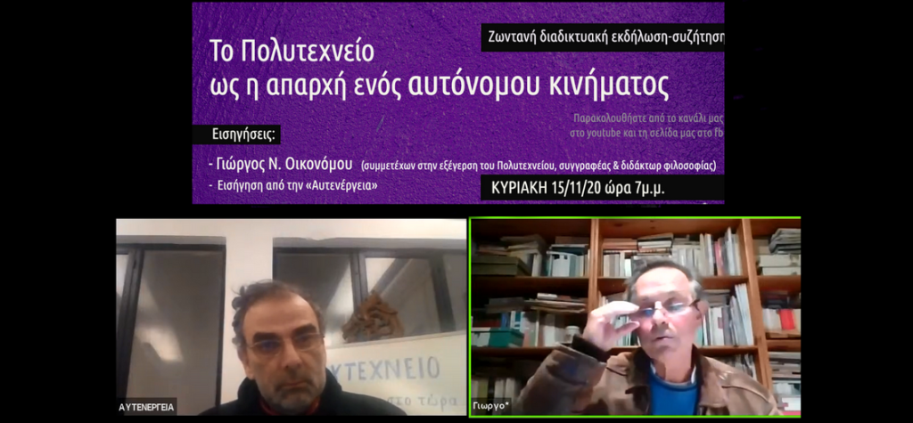 Ακολουθεί το βίντεο της διαδικτυακής εκδήλωσης-συζήτησης που διοργανώθηκε την Κυριακή 15/11 με τίτλο «Το Πολυτεχνείο…Περισσότερα…